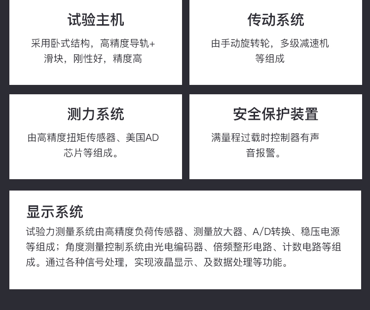 1、可以實現合格性試驗:判定扭矩扭角間的對應關系,觀察試驗是否變形、或是破壞 2、可以實現破壞性試驗:扭斷試驗,扭至試樣斷裂,求取峰值 三、產品構成系統: 1 試驗主機:采用臥式結構,高精度導軌+滑塊,剛性好,精度高。 2 傳動系統:由手動旋轉輪,多級減速機等組成。 3 測力系統:由高精度扭矩傳感器、美國AD芯片等組成。 4 顯示系統:試驗力測量系統由高精度負荷傳感器、測量放大器、A/D轉換、穩壓電源等組成;角度測量控制系統由光電編碼器、倍頻整形電路、計數電路等組成。通過各種信號處理,實現液晶顯示、及數據處理等功能。 5 安全保護裝置:滿量程過載時控制器有聲音報警。