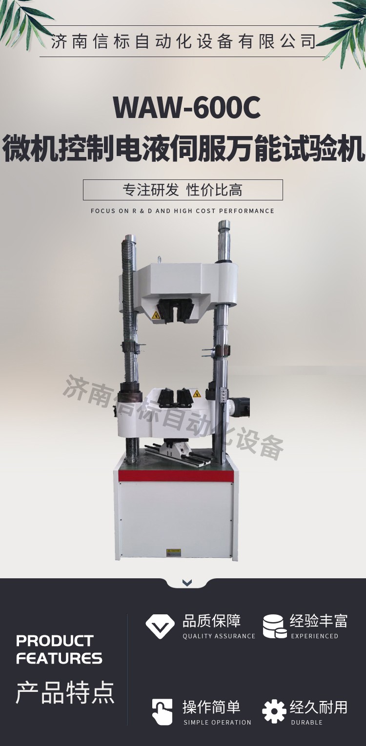 濟南信標自動化設備有限公司主要生產:動靜態萬能疲勞試驗機,接骨板彎曲試驗機,縫合線拉伸疲勞試驗機,髖膝關節磨損試驗機,電子萬能試驗機、液壓萬能試驗機、巖石三軸、四軸,電液拉力試驗機,材料試驗機,高低溫蠕變,高低頻疲勞,拉伸、扭轉、杯突等二十多個系列兩千多個的品種。