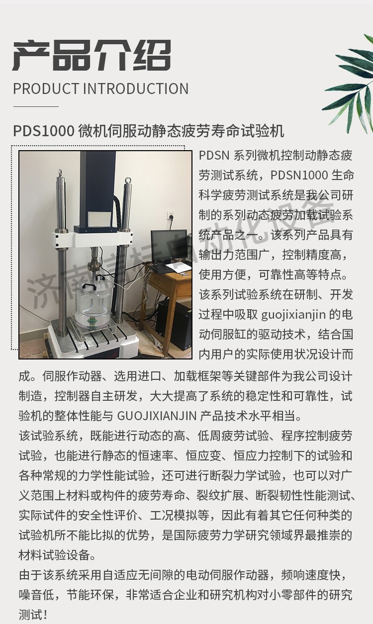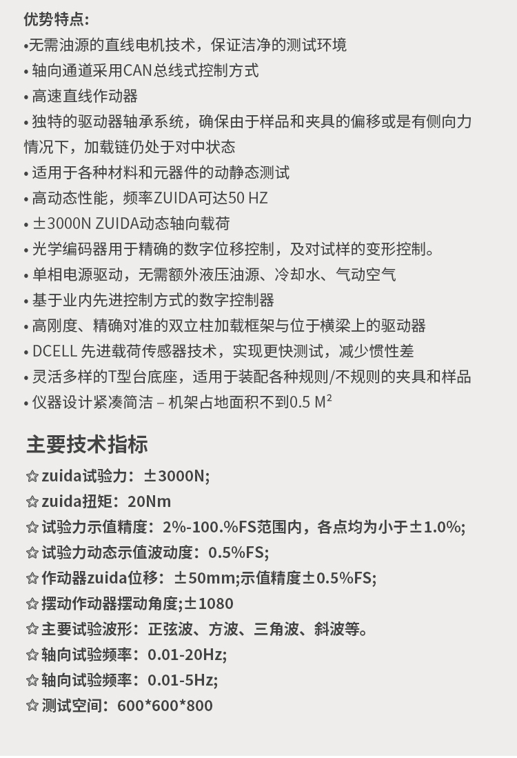 該試驗系統,既能進行動態的高、低周疲勞試驗、程序控制疲勞試驗,也能進行靜態的恒速率、恒應變、恒應力控制下的試驗和各種常規的力學性能試驗,還可進行斷裂力學試驗,也可以對廣義范圍上材料或構件的疲勞壽命、裂紋擴展、斷裂韌性性能測試、實際試件的安全性評價、工況模擬等,因此有著其它任何種類的試驗機所不能比擬的優勢,是國際疲勞力學研究領域界最推崇的材料試驗設備。 由于該系統采用自適應無間隙的電動伺服作動器,頻響速度快,噪音低,節能環保,非常適合企業和研究機構對小零部件的研究測試! 2.優勢特點: ?無需油源的直線電機技術,保證潔凈的測試環境 ? 軸向通道采用Can總線式控制方式 ? 高速直線作動器 ? 獨特的驅動器軸承系統,確保由于樣品和夾具的偏移或是有側向力情況下,加載鏈仍處于對中狀態 ? 適用于各種材料和元器件的動靜態測試 ? 高動態性能,頻率zuida可達50 Hz ? ±3000N zuida動態軸向載荷 ? 光學編碼器用于精確的數字位移控制,及對試樣的變形控制。 ? 單相電源驅動,無需額外液壓油源、冷卻水、氣動空氣 ? 基于業內先進控制方式的數字控制器 ? 高剛度、精確對準的雙立柱加載框架與位于橫梁上的驅動器 ? Dcell 先進載荷傳感器技術,實現更快測試,減少慣性差 ? 靈活多樣的T型臺底座,適用于裝配各種規則/不規則的夾具和樣品