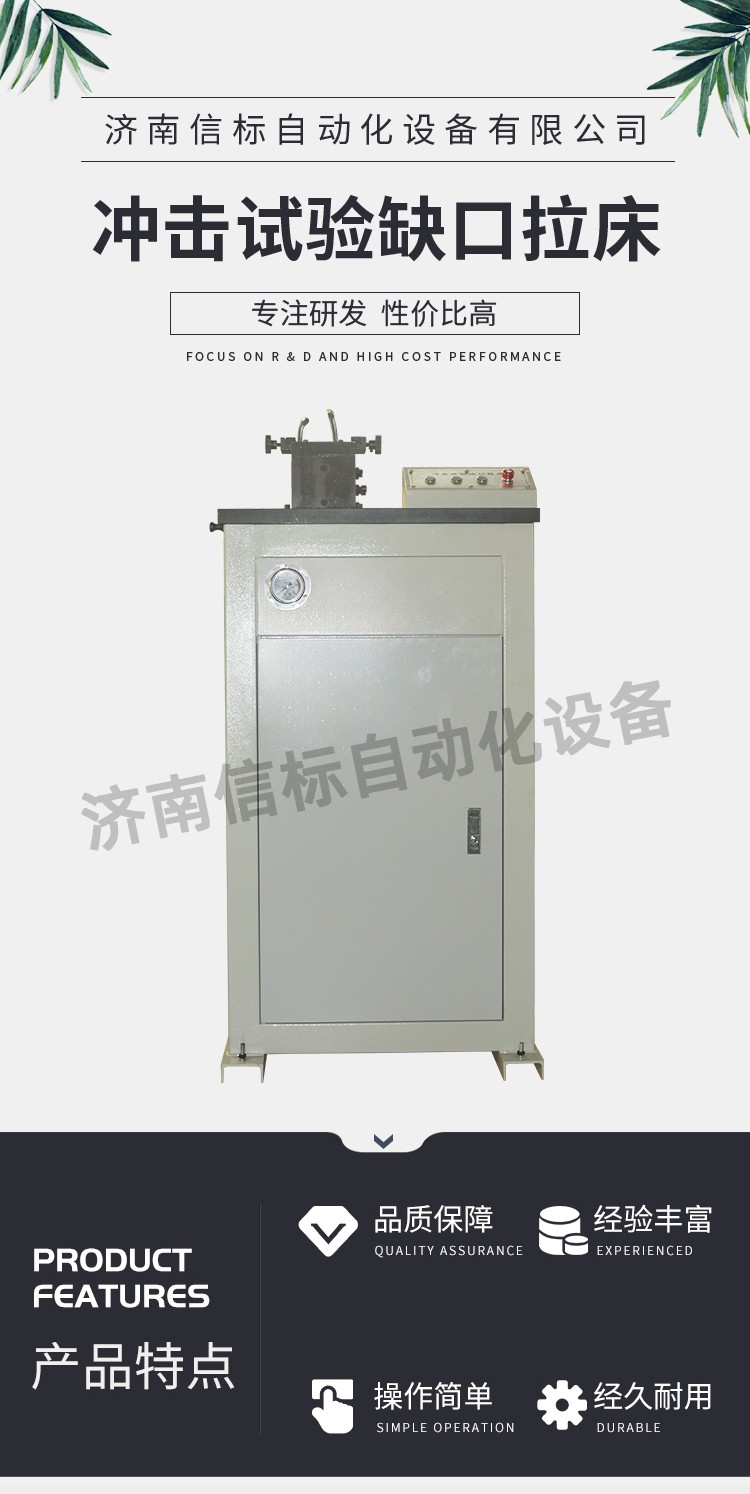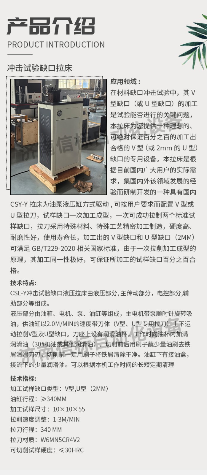 CSY-Y拉床為油泵液壓缸方式驅動,可按用戶要求而配置V 型或U 型拉刀,試樣缺口一次加工成型,一次可成功拉制兩個標準試樣缺口,拉刀采用特殊材料、特殊工藝精密加工制造,硬度高、耐磨性好,使用壽命長,加工出的V 型缺口和U 型缺口(2mm)可滿足GB/T229-2020相關國家標準,由于一次拉削加工成型的原理,其加工同一性極好,可保證所加工的試樣缺口百分之百合格。 三、技術特點: CSL-Y沖擊試驗缺口液壓拉床由液壓部分, 主傳動部分,電控部分,輔助部分等組成。 液壓部分由油箱、電機、泵、油缸等組成,主電機帶泵順時針旋轉吸油,供油缸以2.0m/min的速度帶刀體(V型、U型專用拉刀)上下運動拉削V型及U型缺口。刀座上設有潤滑油杯,工作時向油杯內加滿潤滑油(30#機油或其他潤滑油)。切削前后用刷子蘸少量油刷去鐵屑潤滑刀刃,切削前一定用刷子將鐵屑清除干凈。油缸下有接油盒,接流下的少量潤滑油??梢愿鶕緳C工作時間的長短定期清理 四、技術指標: 加工試樣缺口類型:V型,U型(2mm) 油缸行程:≥340mm 加工試樣尺寸:10×10×55 拉削速度調整:1-3m/min 拉刀行程:340 mm 拉刀材質:W6Mn5Cr4V2 可切削試樣硬度:≤30HRC 五、設備配置: 缺口自動拉床主機 1臺 拉刀及導向裝置 1套 試樣固定裝置 2套 油缸及連接部件 1套 潤滑噴淋系統 1套 10MPa油源動力系統 1套 電氣及控制系統 1套 防護系統(帶開門斷電) 1套 產品合格證 1套 產品使用說明書 1套 產品使用說明書 1套 液壓系統配件 1套