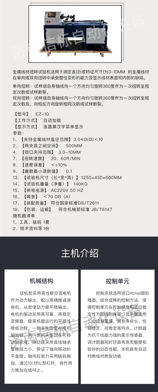 金屬線材扭轉(zhuǎn)試驗機適用標準: 金屬線材扭轉(zhuǎn)試驗機適用于中華人民共和國標準GB/T 239.1-2012《金屬材料 線材 第一部分 單向扭轉(zhuǎn)試驗方法》、GB/T 239.2-2012《金屬材料 線材 第二部分 雙向扭轉(zhuǎn)試驗方法》,也適用于國際標準ISO 7800:2003《金屬線材單向扭轉(zhuǎn)試驗方法》和ISO 9649:1990《金屬線材雙向扭轉(zhuǎn)試驗方法》。 金屬線材扭轉(zhuǎn)試驗機應用領域: 該機主要用于大專院校、科研部門、工礦企業(yè)的力學實驗室的金屬線材的力學性能分析,也廣泛用于生產(chǎn)單位的在線檢測;主要行業(yè)有鋼廠高速線、預應力鋼絲廠、質(zhì)量監(jiān)督、科研院所、公路交通、建筑行業(yè)、鋼絲繩、電線電纜、電氣化鐵道用銅及銅合金導線、銅接觸線等生產(chǎn)和使用部門。 金屬線材扭轉(zhuǎn)試驗機主機介紹: 1、機械結構: 該機型采用高性能交流電機作為動力輸出,配以高精度減速電機,從而使動力能平穩(wěn)輸出。電機的驅(qū)動采用高可靠、高穩(wěn)定變頻器,提高機器運行的平順性,降低功耗。一側(cè)夾頭固定在電機輸出軸,另一側(cè)夾頭固定在可移動軸承座。移動座采用直線軸承,摩擦阻力小,保證了軸向移動的平直度。軸向拉緊力采用砝碼施加,通過10:1的L型杠桿,將作用力施加在線材上。 2、控制單元: 控制系統(tǒng)選用進口Atmel微處理器,結合成熟的控制方法,使得控制單元在控制精度和運行穩(wěn)定性方面得到保證。